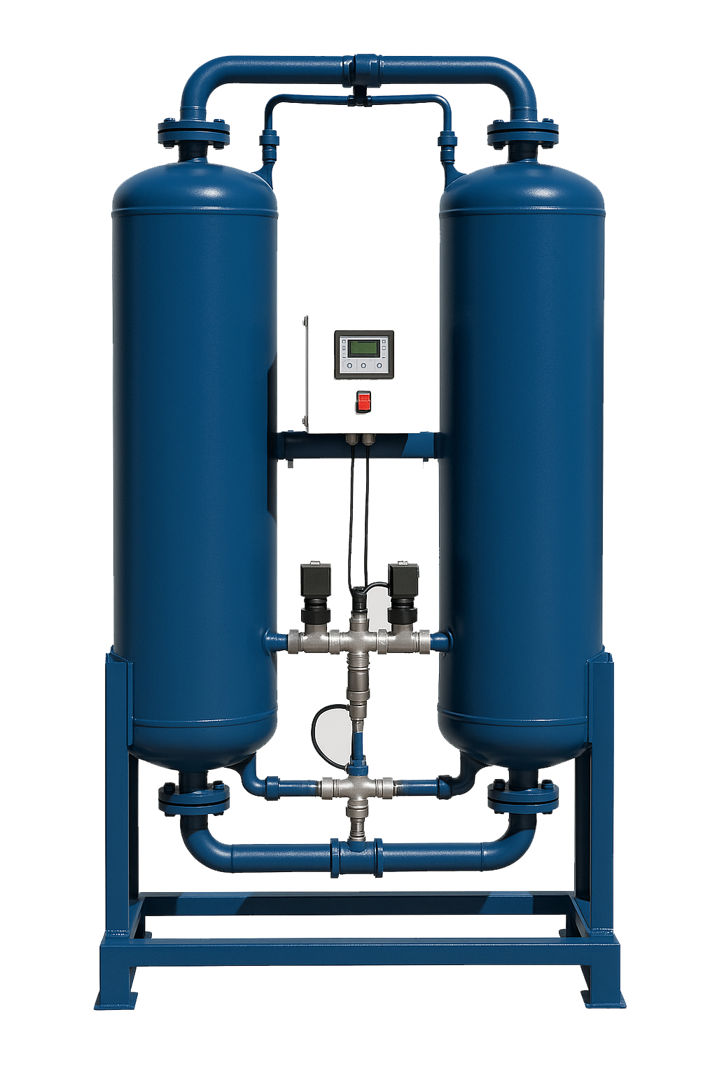 درایر جذبی (Desiccant Dryer) در سیستم هوای فشرده پزشکی یکی از مهمترین اجزای کنترل کیفیت است، زیرا وظیفه دارد رطوبت هوا را تا حد استاندارد پزشکی کاهش دهد و نقطه شبنم بسیار پایین— معمولاً تا 40- درجه سانتیگراد —ایجاد کند. درایر جذبی با استفاده از مواد جاذب مانند آلومینای فعال یا سیلیکاژل، بخار آب موجود در هوا را در فشار بالا جذب میکند و سپس در یک برج موازی طی فرآیند احیا، رطوبت را آزاد میسازد. این چرخهٔ پیوسته باعث میشود هوای خروجی کاملاً خشک و ایمن برای تجهیزات حیاتی مانند ونتیلاتورها، سیستمهای بیهوشی، دستگاههای ICU و ابزار اتاق عمل باشد. در محیط پزشکی، رطوبت میتواند عامل رشد باکتری، خوردگی خطوط، یخزدگی در تجهیزات و کاهش عمر فیلترهای نهایی شود؛ بنابراین استفاده از درایر جذبی الزامی است. این نوع درایر معمولاً در کنار کمپرسورهای روغنی یا کمپرسورهای اسکرال بدون روغن به کار گرفته میشود تا رطوبت و ذرات همراه هوا بهطور کامل حذف شده و کیفیت نهایی مطابق HTM 02-01 و ISO 8573-1 Class 1.2.1 تضمین شود.